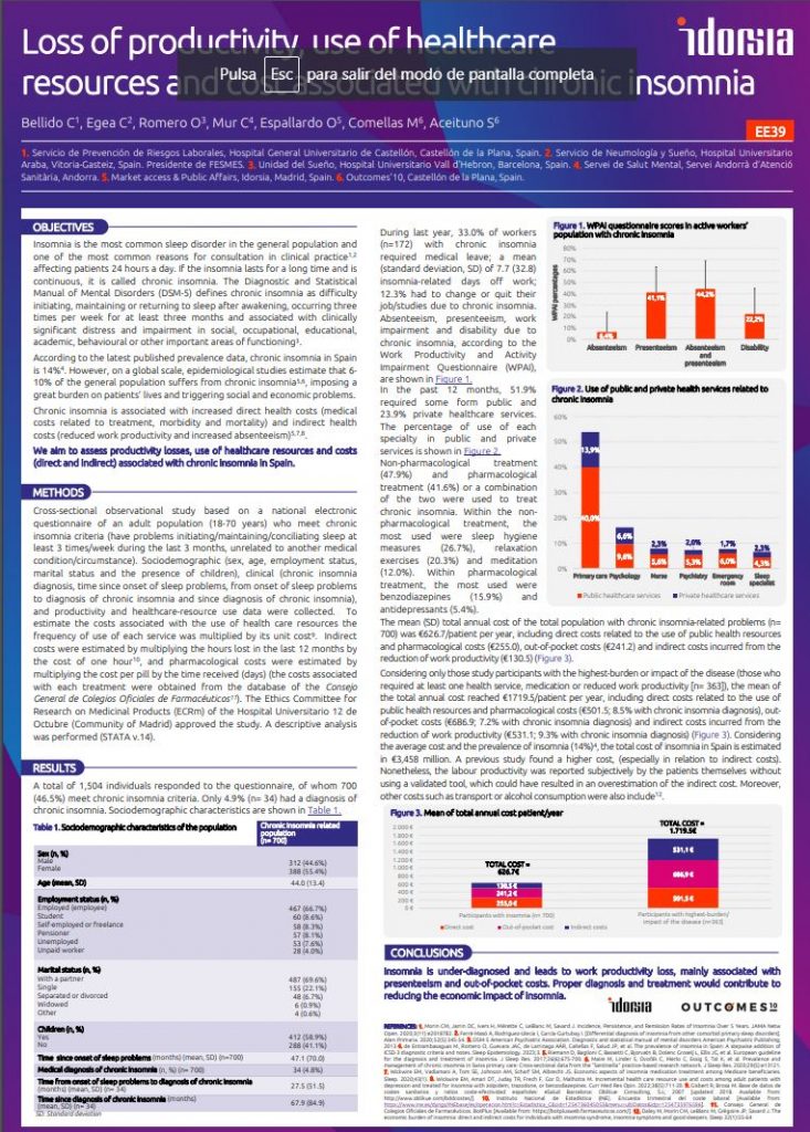 Cross-sectional observational study based on an electronic questionnaire aimed at people with sleep problems who meet the criteria for chronic insomnia. The results show that insomnia is an under-diagnosed disease that leads to a loss of productivity and is strongly linked to presenteeism and costs to be paid by the patient. Proper diagnosis and treatment […]