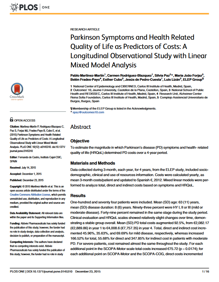 Parkinson Symptoms and Health Related Quality of Life as Predictors of Costs: A Longitudinal Observational Study with Linear Mixed Model Analysis