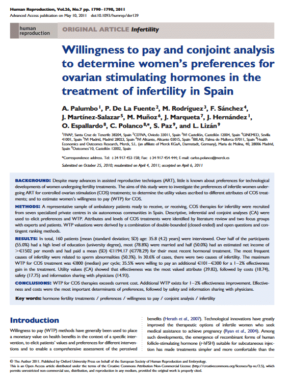 Willingness to pay and conjoint analysis to determine women’s preferences for ovarian stimulating hormones in the treatment of infertility in Spain