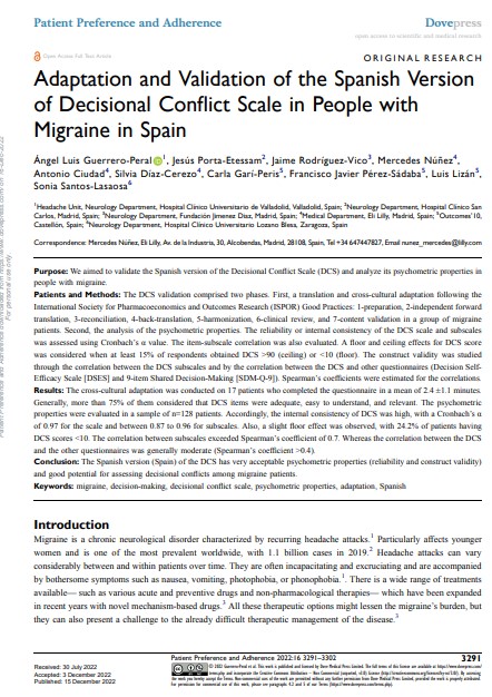 We validated the Spanish version of the Decisional Conflict Scale (DCS) and analyzed its psychometric properties in a cohort of people with migraine. DCS had very acceptable psychometric properties (reliability and construct validity) and good potential for assessing decisional conflicts among migraine patients.