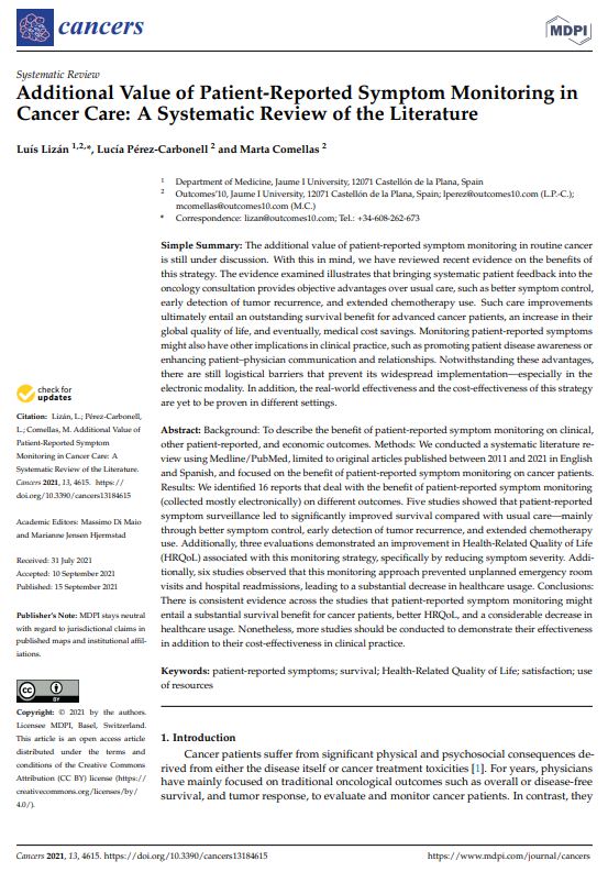 Systematic literature review of the literature about the additional value of patient-reported symptom monitoring in oncologic routine cancer. The evidence examined illustrates that bringing systematic patient feedback into the oncology consultation provides objective advantages over usual care, such as better symptom control, early detection of tumor recurrence, and extended chemotherapy use. Such care improvements ultimately entail an outstanding survival benefit for advanced cancer patients, an increase in their global quality of life.