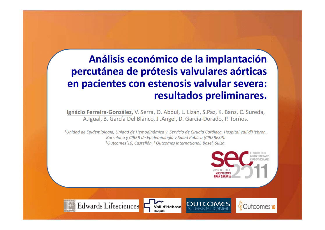 Congress Análisis económico de la implantación transcatéter de prótesis valvulares aórticas en pacientes con estenosis valvular severa: resultados preliminares Authors: Ferreira-Ganzález I, Serra V, Abdul O, Lizán L, Paz S, Banz K, Sureda C, Igual A, García Del Blanco B, Ángel J, García-Dorado D, Tornos P Year: 2011 Congress: Congreso Enfermedades Cardiovasculares (SEC)