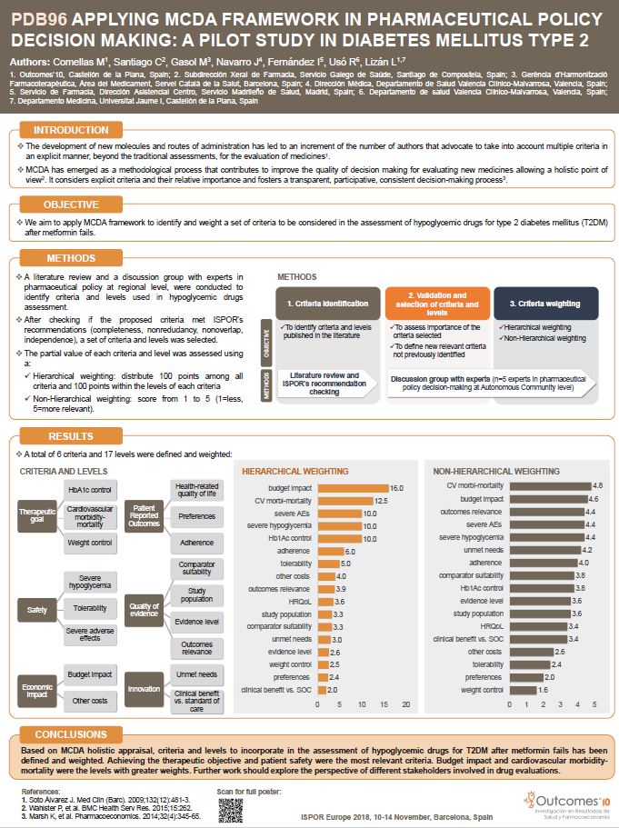 Congress Applying MCDA framework in pharmaceutical policy decision making: a pilot study in diabetes mellitus type 2 Finalist for a Research Poster Presentation Award Authors: Comellas M, Santiago C, Gasol M, Navarro J, Fernández I, Usó R, Lizán L Year: 2018 Congress: ISPOR Europe 2018