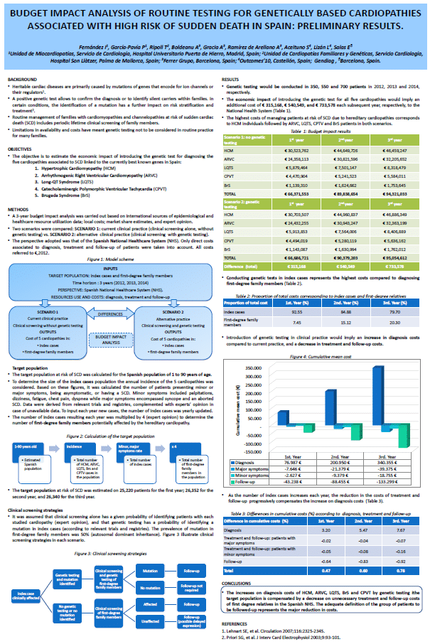 Congress Budget impact analysis of routine testing for genetically based cardiopathies associated with high risk of sudden death in Spain: preliminary results Authors: Fernández I, García-Pavía P, Ripoll T, Boldeanu A, Gracia A, Ramírez De Arellano A, Aceituno S, Lizán L, Salas E Year: 2012 Congress: ISPOR 15th Annual European Congress