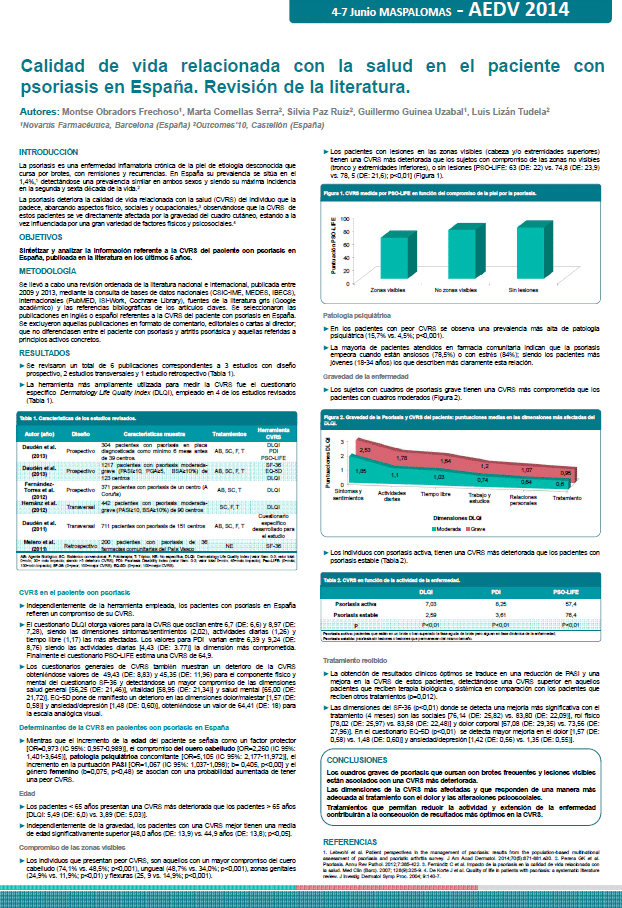 Congress Calidad de vida relacionada con la salud en el paciente con psoriasis en España. Revisión de la literatura Authors: Obradors Frechoso M, Comellas Serra M, Paz Ruiz S, Guinea Uzabal G, Lizán Tudela L Year: 2014 Congress: 42 Congreso Nacional de Dermatología y Venerologia (AEDV)