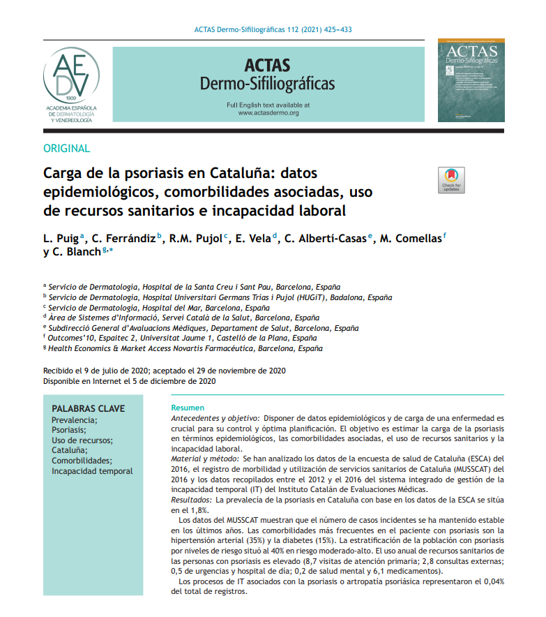 Estimation of the epidemiologic burden of psoriasis and evaluation of the associated comorbidities, health care utilization, and sick leave, based on data from the 2016 Catalan Health Survey, the Catalan Registry of Morbidity and Utilization of Health Care Services (2016), and the database of the Catalan Medical Evaluations Institute (2012—2016).