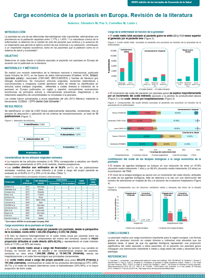 Congress Carga económica de la psoriasis en Europa. Revisión de la literatura Authors: Obradors M, Paz S, Comellas M, Lizán L Year: 2014 Congress: XXXIV Jornadas de Economía de la Salud (AES)