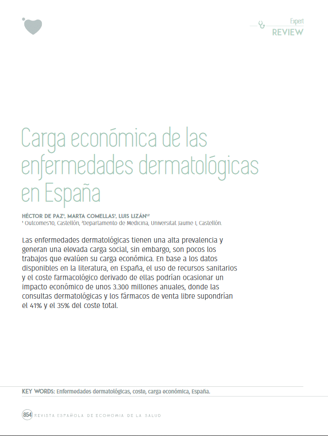 Articles Carga económica de las enfermedades dermatológicas en España Authors: de Paz HD, Comellas M, Lizán L Journal: Revista Española de Economía de la Salud Reference: Rev Esp Econ Salud. 2016;11(5):855-863 Outside URL