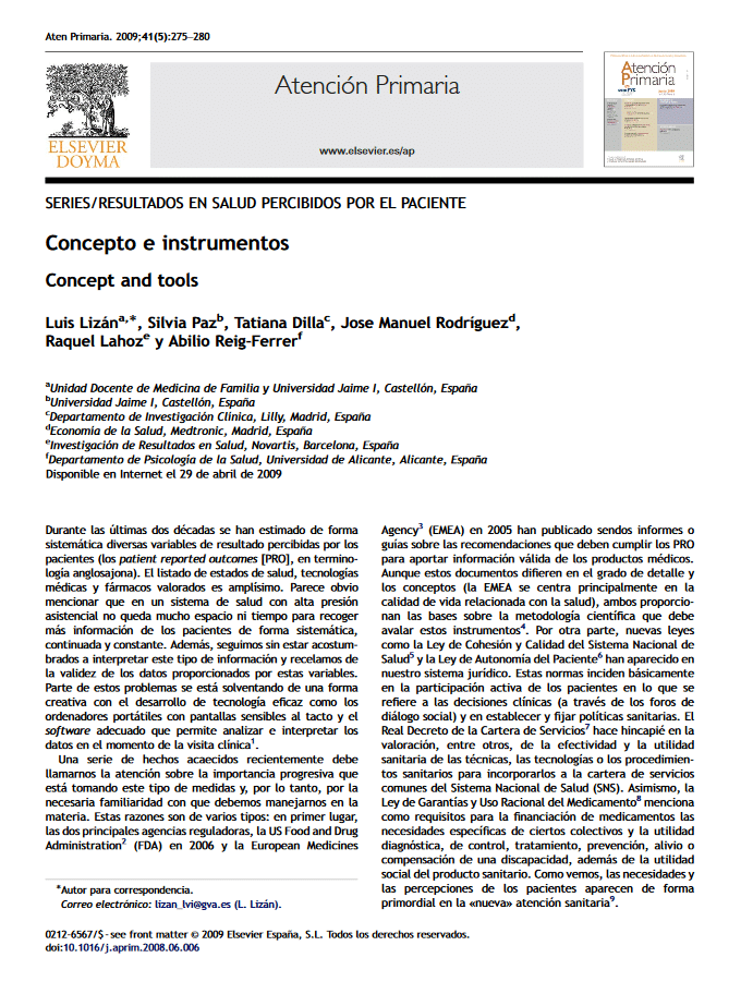Articles Concepto e instrumentos Authors: Lizán L, Paz S, Dilla T, Rodríguez JM, Lahoz R, Reig-Ferrer A Journal: Atención Primaria Reference: Aten Primaria 2009; 41(5): 275-80 Outside URL