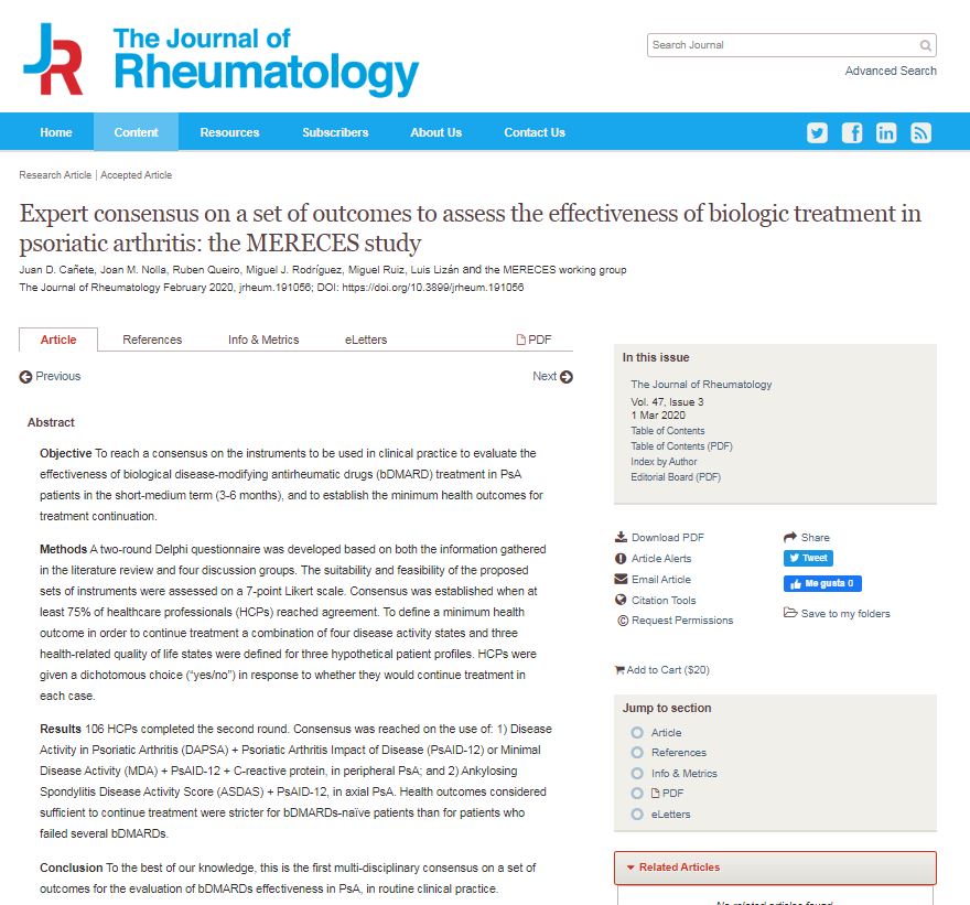 Articles Expert consensus on a set of outcomes to assess the effectiveness of biologic treatment in psoriatic arthritis: the MERECES study Authors: Juan D. Cañete, Joan M. Nolla, Ruben Queiro, Miguel J. Rodríguez, Miguel Ruiz, Luis Lizán y el grupo de trabajo de MERECES. Journal: The Journal of Rheumatology Year: 2020 Reference: https://doi.org/10.3899/jrheum.191056 Outside URL