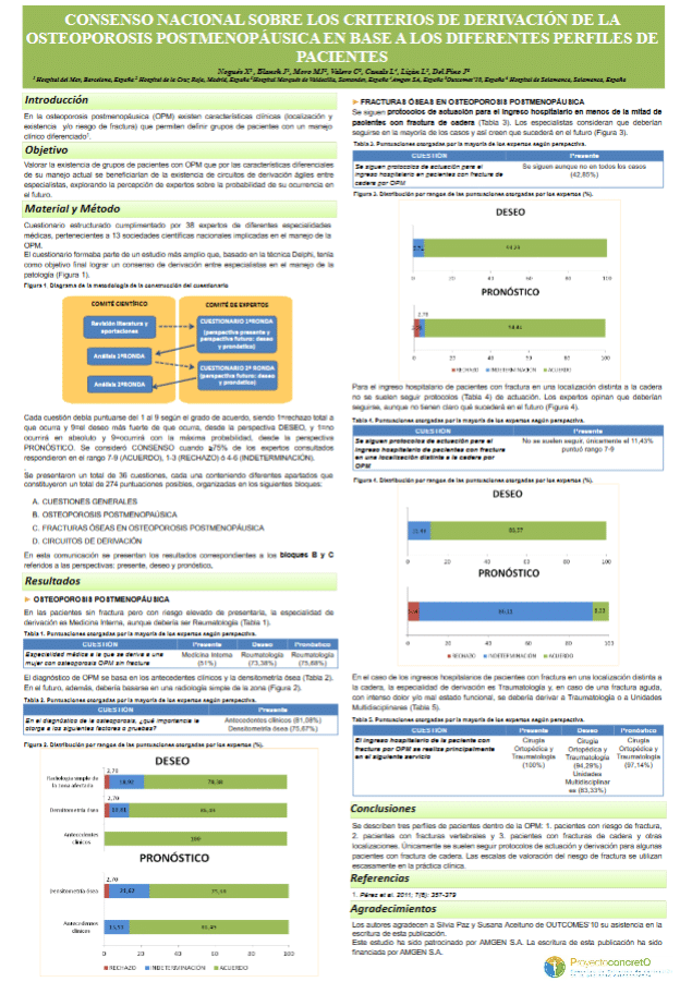 Congress Consenso nacional sobre los criterios de derivación de la osteoporosis postmenopáusica en base a los diferentes perfiles de pacientes Authors: Nogués X, Blanch J, Moro MJ, Valero C, Canals L, Lizán L, Del Pino J. Year: 2012 Congress: XVI Congreso Sociedad Española de Investigación Ósea y del Metabolismo Mineral (SEIOMM)