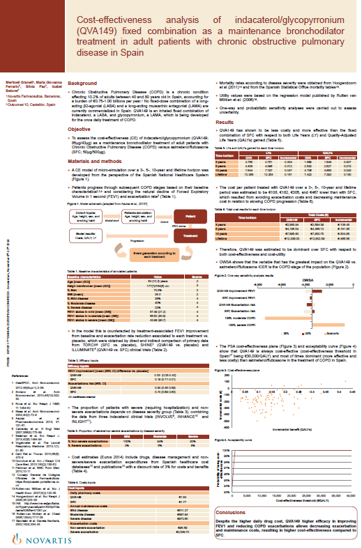 Congress Cost-effectiveness analysis of indacaterol / glycopirronium (QVA149) fixed combination as a maintenance bronchodilator treatment in adult patients with chronic obstructive pulmonary disease in Spain Authors : Granell M, Giovanna MG, Paz S, Betoret I Year: 2014 Congress: ISPOR 17th Annual European Congress