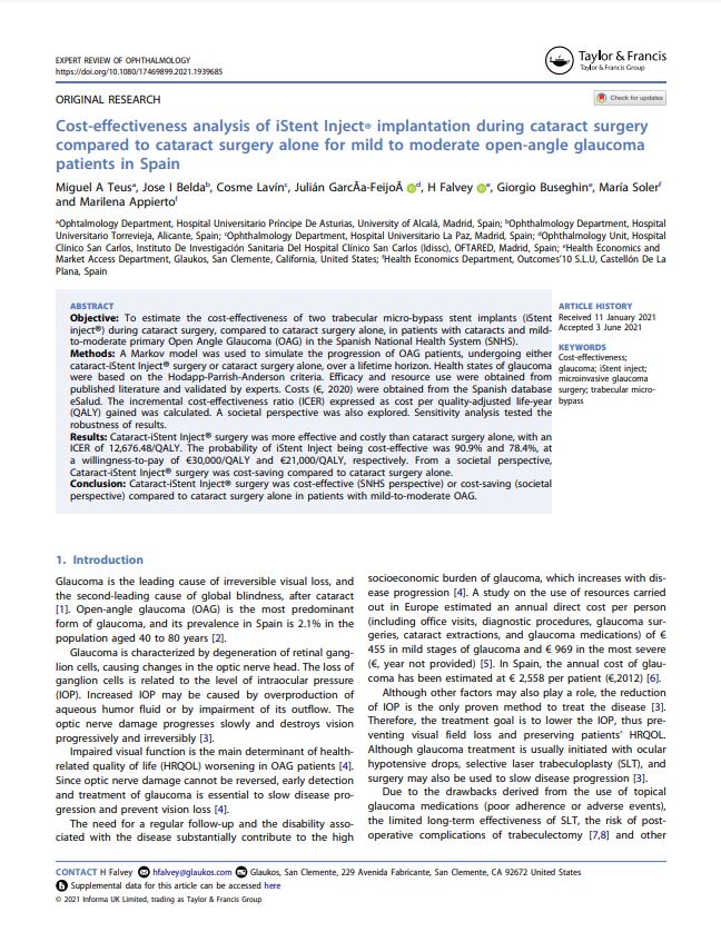 Cost-effectiveness analysis of two trabecular micro-bypass stent implants (iStent inject®) during cataract surgery, compared to cataract surgery alone, in patients with cataracts and mild-to-moderate primary Open Angle Glaucoma in the Spanish National Health System.