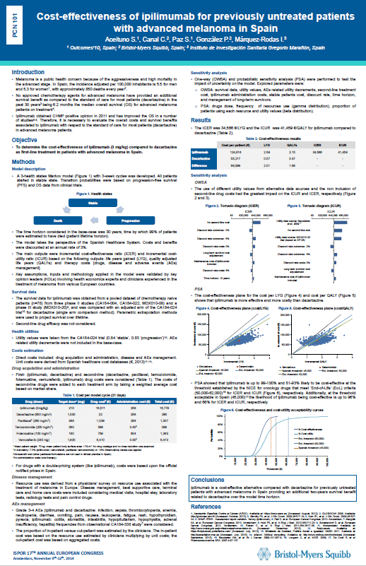 Congress Cost-effectiveness of ipilimumab for previously untreated patients with advanced metastatic melanoma in Spain Authors: Aceituno S, Canal C, Paz S, González P, Márquez-Rodas I Year: 2014 Congress: ISPOR 17th Annual European Congress