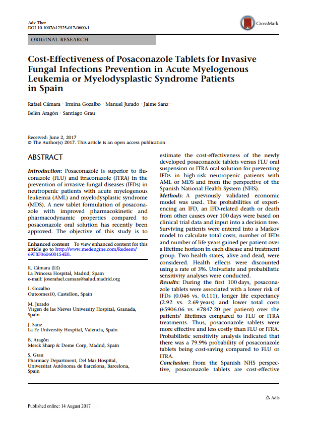 Articles Cost-Effectiveness of Posaconazole Tablets for Invasive Fungal Infections Prevention in Acute Myelogenous Leukemia or Myelodysplastic Syndrome Patients in Spain Authors: Cámara R, Gozalbo I, Jurado M, Sanz J, Aragón B, Grau S Journal: Advances in Therapy Year: 2017 Reference: Adv Ther DOI 10.1007/s12325-017-0600-1 Outside URL
