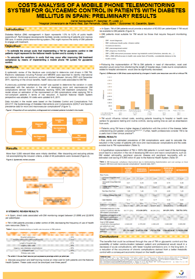 Congress Costs analysis of a mobile phone telemonitoring system for glycaemic control in patients with diabetes mellitus in Spain: preliminary results Authors: Carral F, Sánchez P, Lizán L. Year: 2012 Congress: ISPOR 15th Annual European Congress