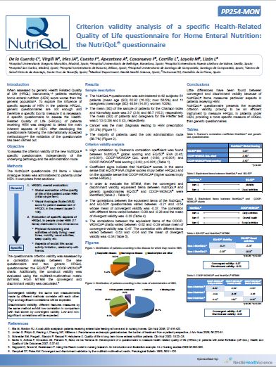 Congress Criterion validity analysis of a specific Health-Related Quality of Life questionnaire for home enteral nutrition: the NutriQol® questionnaire Authors: De La Cuerda C, Virgili N, Irles JA, Cuesta F, Apezetxea A, Casanueva F, Carrillo L, Layola M, Lizán L. Year: 2013 Congress: 35th European Society for Clinical Nutrition and Metabolism Congress (ESPEN)