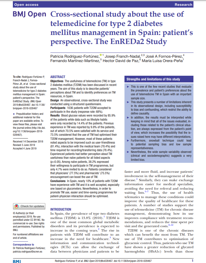 Articles Cross-sectional study about the use of telemedicine for type 2 diabetes mellitus management in Spain: patient’s perspective. The EnREDa2 Study The study describes patients’ perception of telemedicine and their preferences for telemedicine resources in Spain. Authors: Patricia Rodríguez-Fortúnez, Josep Franch-Nadal, José A Fornos-Pérez, Fernando Martínez-Martínez, Hector David de Paz, María Luisa Orera-Peña Journal: BMJ Open Year: 2019 Outside URL