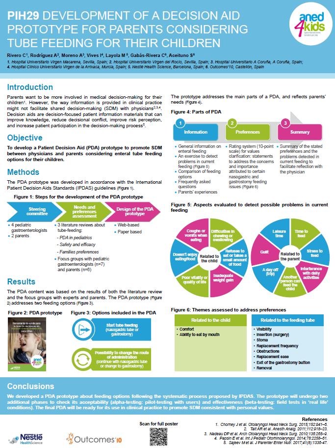Congress Development of a decision aid prototype for parents considering tube feeding for their children Authors: Rivero C, Rodríguez A, Moreno A, Vives I, Layola M, Gabás-Rivera C, Aceituno S Year: 2018 Congress: ISPOR Europe 2018
