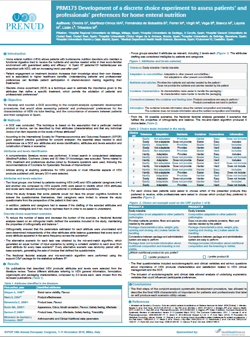 Congress Development of a discrete choice experiment to assess patients’ and professionals’ preferences for home enteral nutrition Authors : Olveira G, Martínez-Olmos MA, Fernández de Bobadilla B, Ferrer M, Virgili N, Vega B, Blanco M, Layola M, Lizán L, Tribaldos M Year: 2015 Congress: ISPOR 18th Annual European Congress