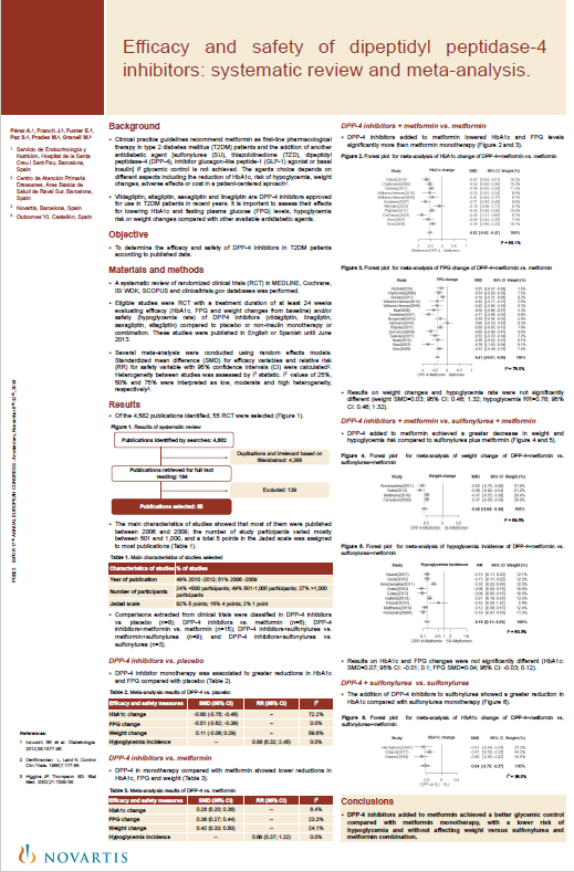 Congress Efficacy and safety of dipeptidyl peptidase-4 inhibitors: systematic review and meta-analysis Authors: Pérez A, Franch J, Fuster E, Paz S, Prades M, Granell M Year: 2014 Congress: ISPOR 17th Annual European Congress