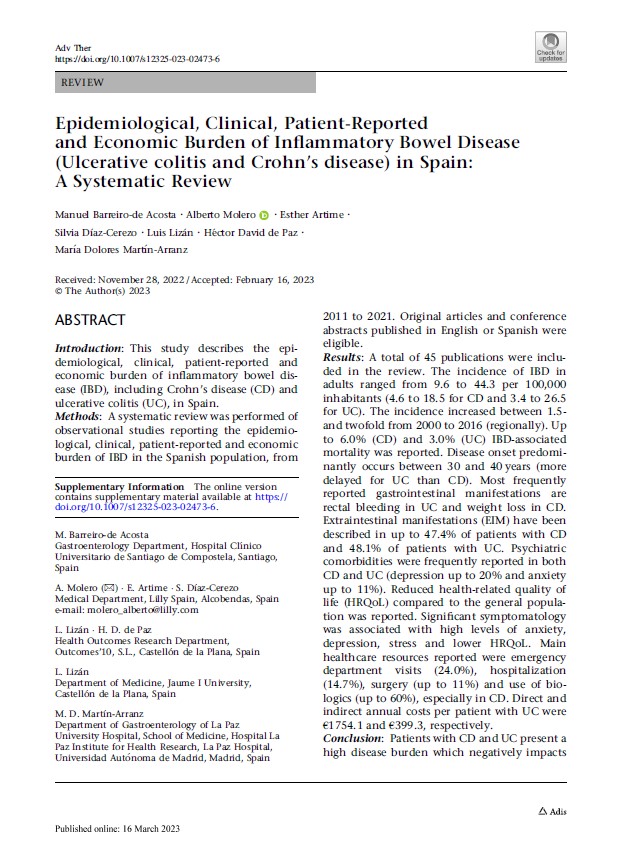 This study describes the epidemiological, clinical, patient-reported and economic burden of inflammatory bowel disease (IBD), including Crohn’s disease (CD) and ulcerative colitis (UC), in Spain.