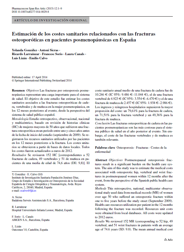 Articles Estimación de los costes sanitarios relacionados con las fracturas osteoporóticas en pacientes posmenopáusicas en España Authors: González Y, Sicras A, Larraínzar R, Sorio F, Canals L, Lizán L, Calvo E Journal: Pharmacoeconomics Spanish Research Articles Reference: PharmacoEcon Span Res Artic. 2015; 12(1): 1-9 Outside URL