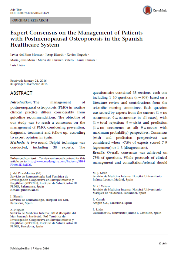 Articles Expert Consensus on the Management of Patients with Postmenopausal Osteoporosis in the Spanish Healthcare System Authors: Del Pino-Montes J, Blanch J, Nogués X, Moro MJ, Valero MC, Canals L, Lizán L Journal: Advances in Therapy Reference: Adv Ther 2016; 33(4): 658-69 Outside URL
