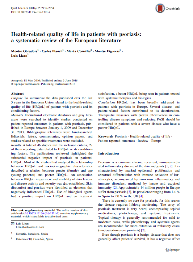 Articles Health-related quality of life in patients with psoriasis: a systematic review of the European literature Autores: Authors: Obradors M, Blanch C, Comellas M, Figueras M, Lizan L Journal: Quality of Life Research Reference: Qual Life Res. 2016;25(11):2739-2754 Outside URL