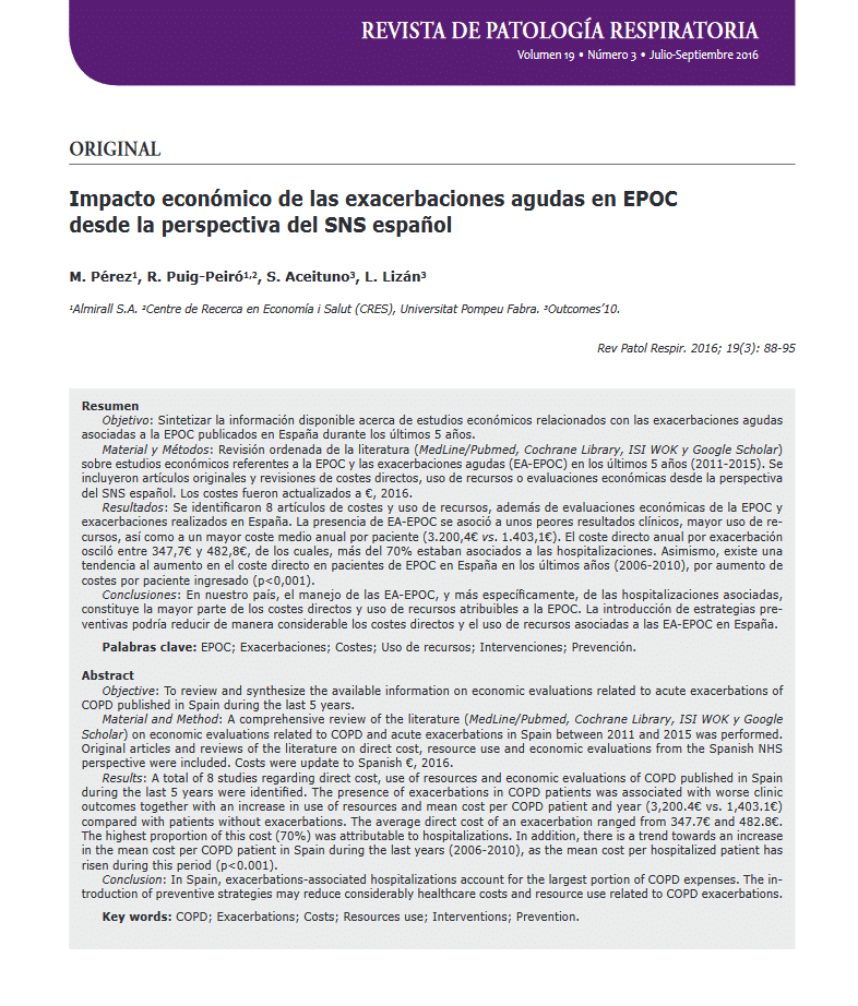 Articles Impacto económico de las exacerbaciones agudas en EPOC desde la perspectiva del SNS español Autores: Authors: Pérez M, Puig-Peiró R, Aceituno S, Lizán L Journal: Revista de Patología Respiratoria Reference: Rev Patol Respir. 2016; 19(3): 88-95 Outside URL