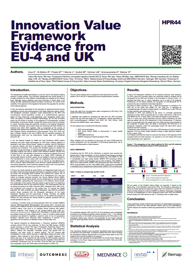 Authors: Entela Xoxi, Intexo SB, Rome, RM, Italy; Asis Ariznavarreta, Outcomes10 Castellon, CS, Spain; Rossella Di Bidino, Fondazione Policlinico Universitario Agostino Gemelli IRCCS, Roma, RM, Italy; Mathilde Guillot, Nextep and MEDVANCE France, Paris, 75, France; Lauren Morris, Remap Consulting UK Ltd, Alderley Edge, CHE, United Kingdom; Mariangela Prada, Intexo SB, Rome, RM, Italy; Lutz Vollmer, MArS - Market Access & Pricing Strategy GmbH and MEDVANCE Germany, Tuebingen, BW, Germany; Stefan Walzer, MArS Market Access & Pricing GmbH, State University Baden-Wuerttemberg, University of Applied Sciences Weingarten-Ravensburg, Weil am Rhein, Germany