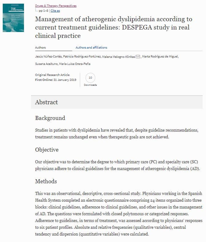 Articles Management of atherogenic dyslipidemia according to current treatment guidelines: DESPEGA study in real clinical practice Authors: Núñez-Cortés J, Rodríguez-Fortúnez P, Melogno-Klinkas M; Rodríguez de Miguel M, Aceituno S, Orera-Peña ML Journal: Drugs & Therapy Perspectives Year: 2019 Reference: DOI: 10.1007/s40267-019-00605-z Outside URL