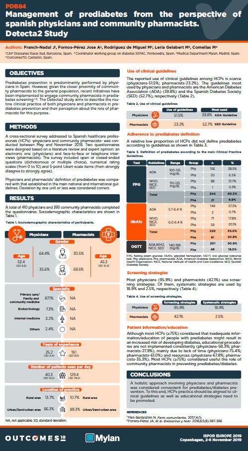Congress Management of prediabetes from the perspective of spanish physicians and community pharmacists. Detecta2 Study Authors: Franch-Nadal J, Fornos-Pérez Jose A, Rodríguez de Miguel M, Lería Gelabert M, Comellas M. Year: 2019 Congress: ISPOR 2019 Download PDF