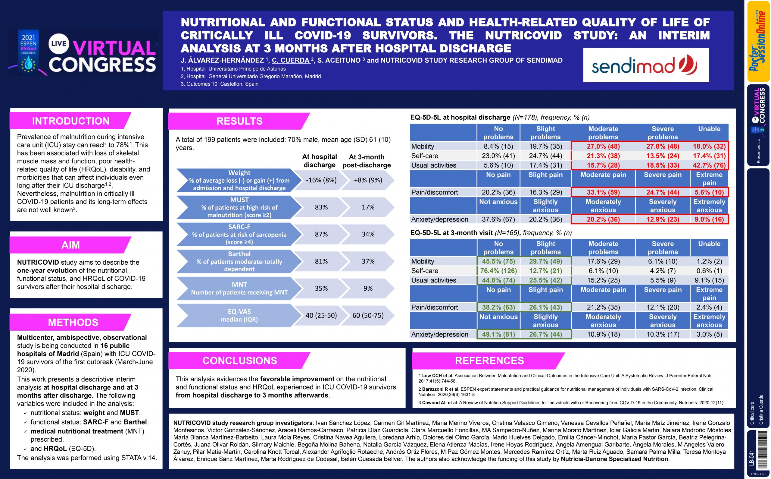 An intermediate descriptive analysis 3 months after discharge from this multicenter, ambispective and observational study conducted in 16 hospitals in Madrid (Spain) with survivors of the first COVID-19 outbreak in the ICU. Sponsored by SENDIMAD, funded by Nutricia-Danone Specialized Nutrition.