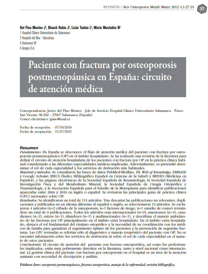 Articles Paciente con fractura por osteoporosis postmenopáusica en España: circuito de atención médica Authors: Del Pino Montes J, Blanch Rubio J, Lizán Tudela L, Marín Montañés N Journal: Osteoporosis y Metabolismo Mineral Reference: Rev Osteoporos Metab Miner 2012 4;1:27-35 Outside URL