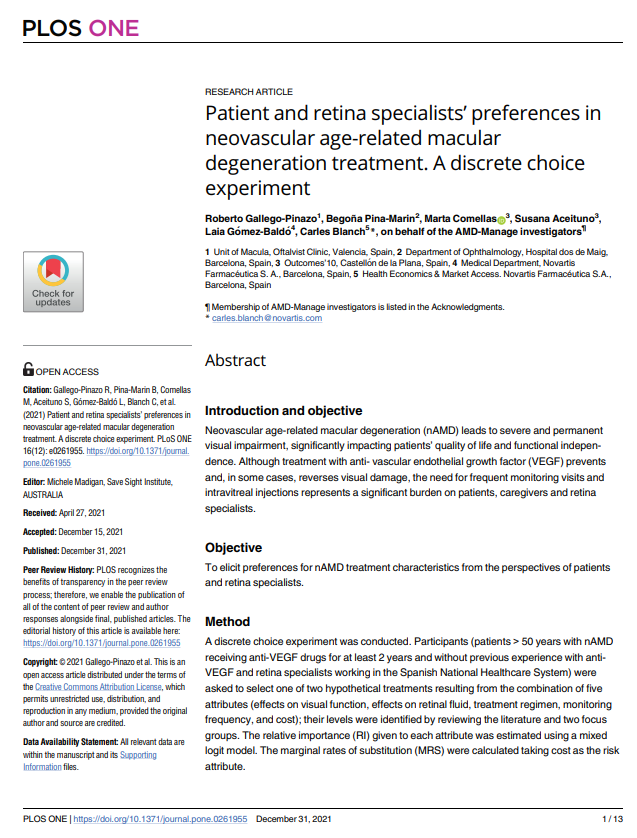 Discrete choice experiment to elicit preferences for neovascular age-related macular degeneration treatment characteristics from the perspectives of patients and retina specialists.