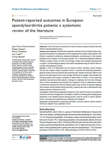 Articles Patient-reported outcomes in European spondyloarthritis patients: a systematic review of the literature Authors: Torre Alonso JC, Queiro R, Comellas M, Lizán L, Blanch C Journal: Patient Preference and Adherence Year: 2018 Reference: Patient Preference and Adherence 2018:12 733–747 Outside URL