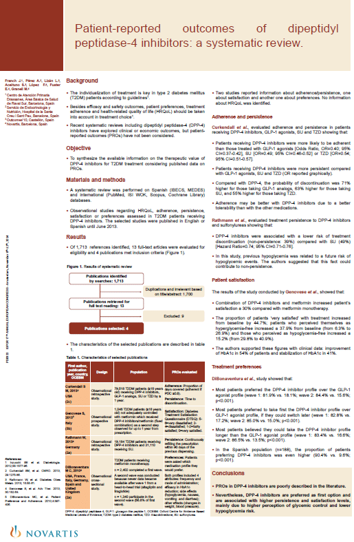 Congress Patient-reported outcomes of dipeptidyl peptidase-4 inhibitors: a systematic review Authors: Franch J, Pérez A, Lizán L, Aceituno S, López F, Fuster E, Granell M Year: 2014 Congress: ISPOR 17th Annual European Congress