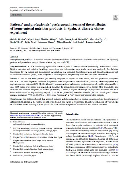 Articles Patients’ and professionals’ preferences in terms of the attributes of home enteral nutrition products in Spain. A discrete choice experiment