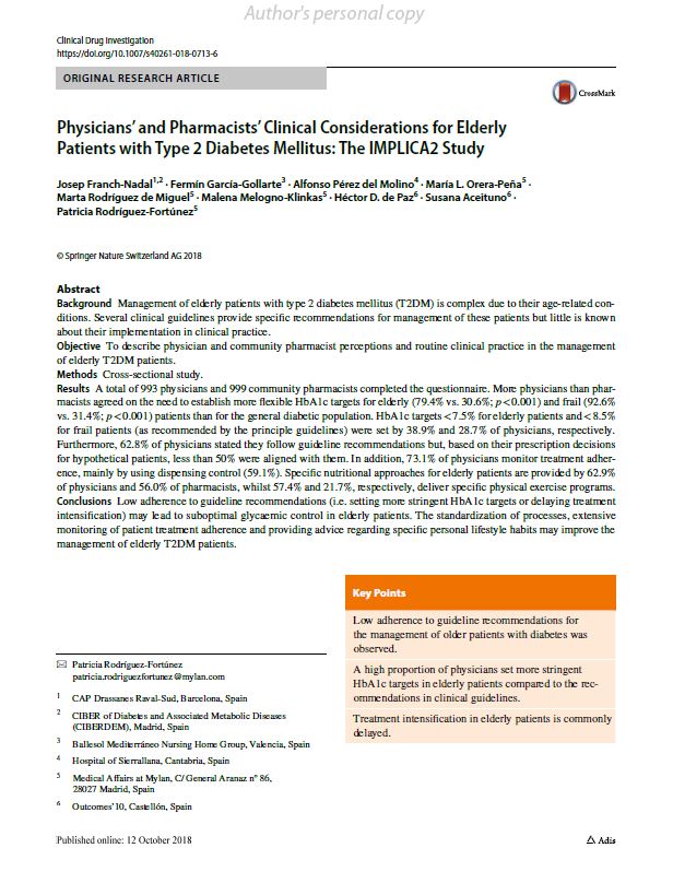 Articles Physicians’ and Pharmacists’ Clinical Considerations for Elderly Patients with Type 2 Diabetes Mellitus: The IMPLICA2 Study Authors: Franch-Nadal J, García-Gollarte F, Pérez del Molino A, Orera-Peña ML, Rodríguez de Miguel M Journal: Clinical Drug Investigation Year: 2018 Reference: Clin Drug Investig. 2018 Oct 12. doi: 10.1007/s40261-018-0713-6. [Epub ahead of print] Outside URL