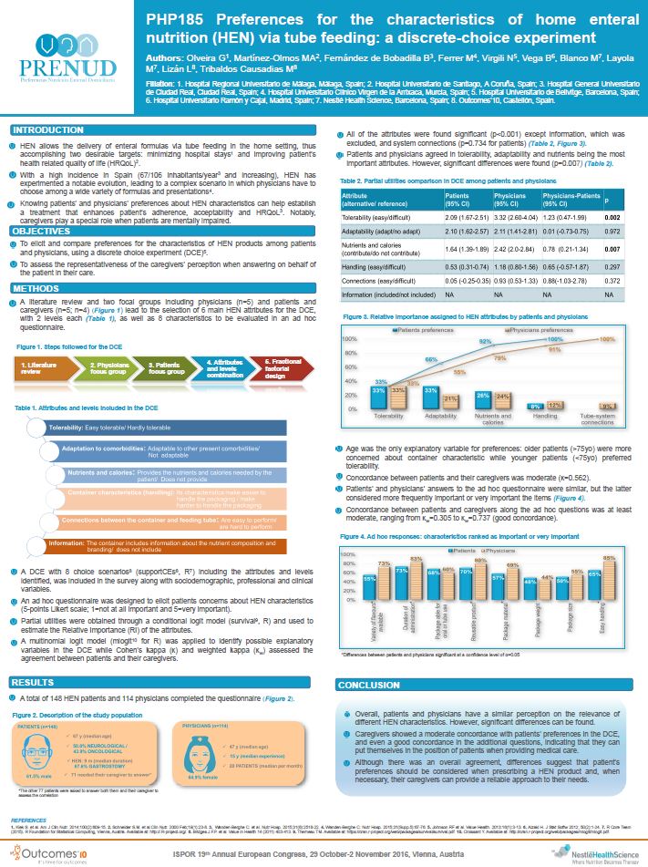 Congress Preferences for the characteristics of Home Enteral Nutrition (HEN) via tube feeding: a discrete-choice experiment Autores: Authors: Olveira G, Martínez-Olmos MA, Fernández de Bobadilla B, Ferrer M, Virgili N, Vega B, Blanco M, Layola M, Lizán L, Tribaldos de Suárez M Year: 2016 Congress: ISPOR 19th Annual European Congress Download PDF