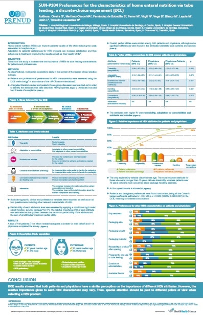 Congress Preferences for the characteristics of home enteral nutrition via tube feeding: a discrete-choice experiment (DCE) Authors: Olveira G, Martínez-Olmos MA, Fernández de Bobadilla B, Ferrer M, Virgili N, Vega B, Blanco M, Layola M, Lizán L, Tribaldos Causadias M Year: 2016 Congress: 38th European Society for Clinical Nutrition and Metabolism Congress (ESPEN) Download PDF