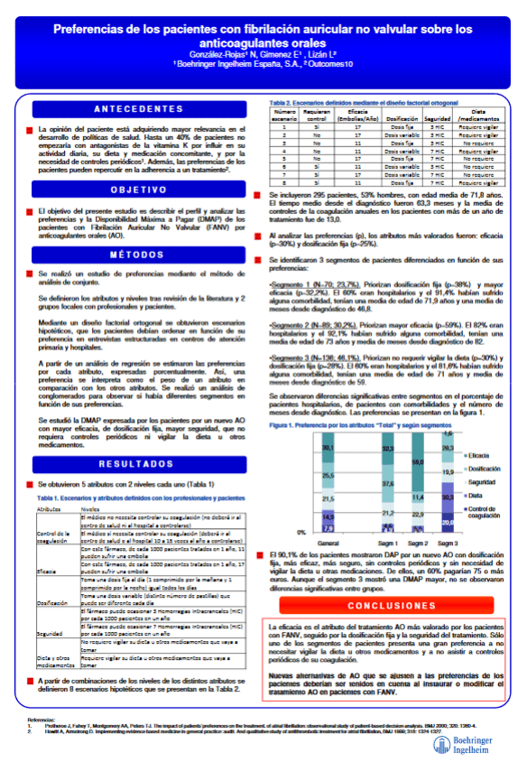 Congress Preferencias de los pacientes con fibrilación auricular no valvular sobre los anticoagulantes orales Authors: González-Rojas N, Giménez E, Lizán L Year: 2011 Congress: XXXI Jornadas de Economía de la Salud (AES)