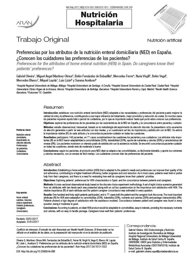 Articles Preferencias por los atributos de la nutrición enteral domiciliaria (NED) en España. ¿Conocen los cuidadores las preferencias de los pacientes? Authors: Olveira G, Martínez-Olmos MA, Fernández de Bobadilla B, Ferrer M, Virgili N, Vega B, Blanco M, Layola M, Lizán L , Aceituno S Journal: Nutrición Hospitalaria Year: 2017 Reference: Nutr Hosp. 2017; 34(5):1013-1023 Outside URL