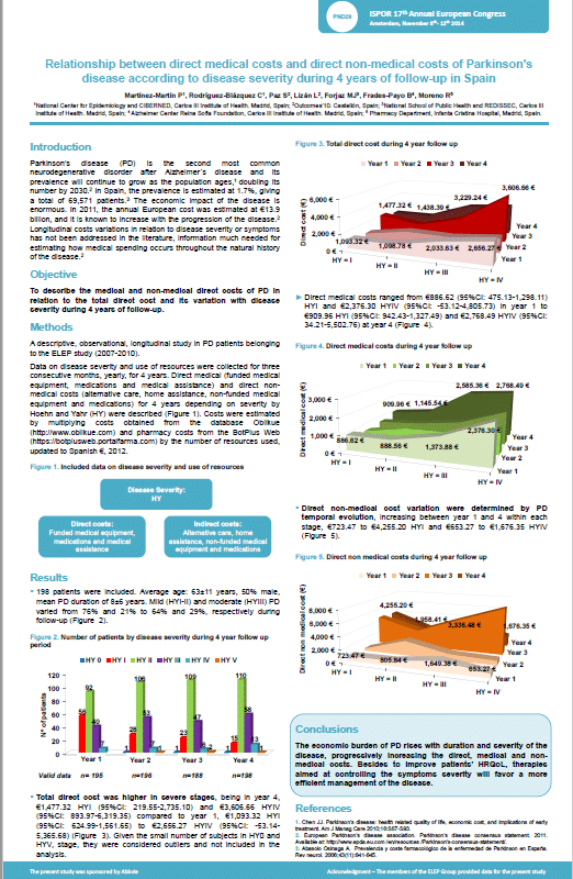 Congress Relationship between the direct medical costs and direct non-medical costs of parkinson’s disease according to disease severity during 4 years of follow-up in Spain Authors: Martínez P, Rodríguez-Blázquez C, Paz S, Lizán L, Forjaz MJ, Frades B, Moreno R Year: 2014 Congress: ISPOR 17th Annual European Congress