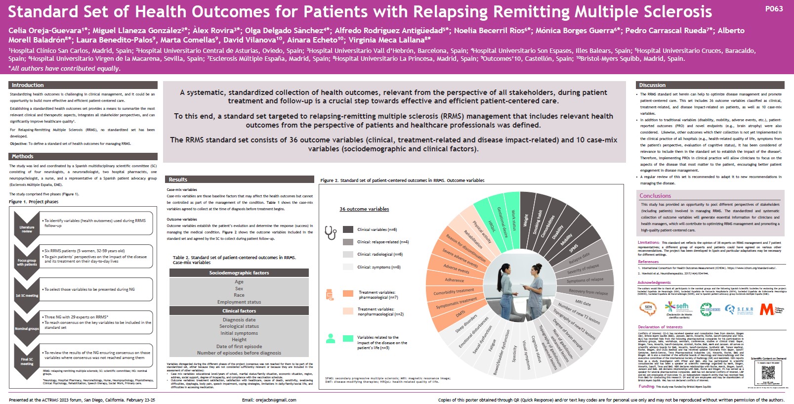 A systematic, standardized collection of health outcomes, relevant from the perspective of all stakeholders, during patient treatment and follow up is a crucial step towards effective and efficient patient centered care. To this end, a standard set targeted to relapsing remitting multiple sclerosis (RRMS) management that includes relevant health outcomes from the perspective of patients and healthcare professionals was defined. Congreso: Congreso de la Sociedad Española de Alergología e Inmunología Clínica (SEAIC).