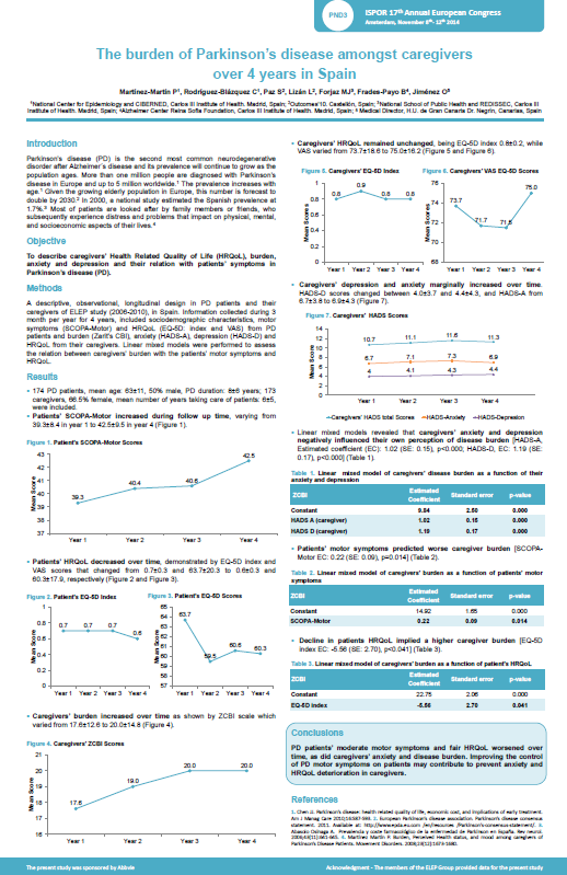 Congress The burden of parkinson disease amongst caregivers in Spain over 4 years Authors: Martínez P, Rodríguez-Blázquez C, Paz S, Lizán L, Forjaz MJ, Frades B, Jiménez OL Year: 2014 Congress: ISPOR 17th Annual European Congress