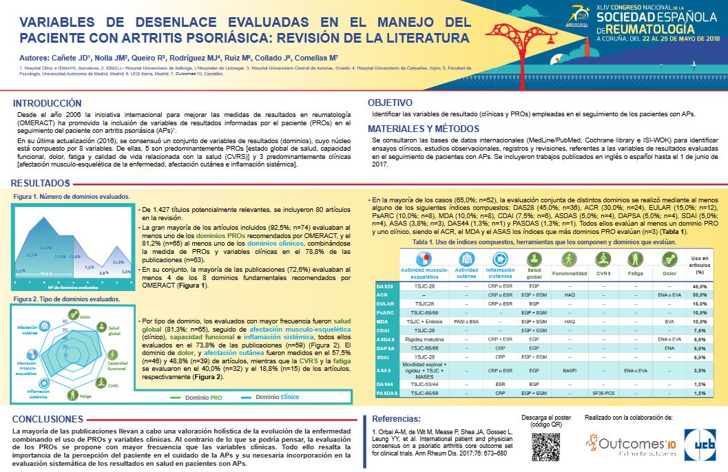 Congress Variables de desenlace evaluadas en el manejo del paciente con artritis psoriásica: revisión de la literatura Authors: Cañete JD, Nolla JM, Queiro R, Rodríguez MJ, Ruiz M, Collado J, Comellas M Year: 2018 Congress: SER - XLIV Congreso de la Sociedad Española de Reumatologia Download PDF